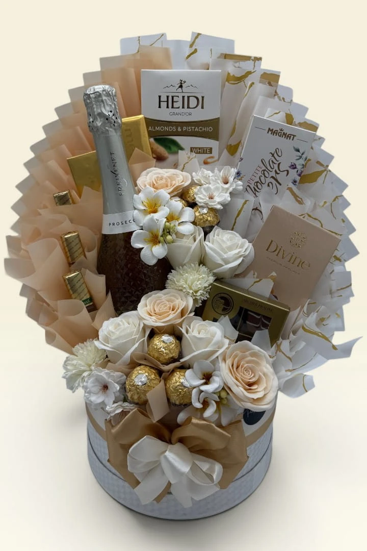 Centralnym punktem kompozycji jest prosecco, otoczone starannie dobranymi słodyczami premium oraz kwiatami, które tworzą luksusową i spójną całość. To prezent, który łączy smak, estetykę i emocje.