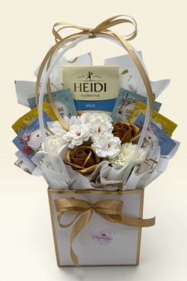 Zestaw wyróżnia się nietypowym opakowaniem w formie białego, tekturowego koszyka z wysokimi uchwytami. Tło stanowi wachlarz z delikatnej bibuły, który nadaje całości lekkości. Koszyk zdobią satynowe wstążki w kolorze złotym, które spięte są w efektowną kokardę na pałąku oraz mniejszą kokardkę z przodu pudełka.