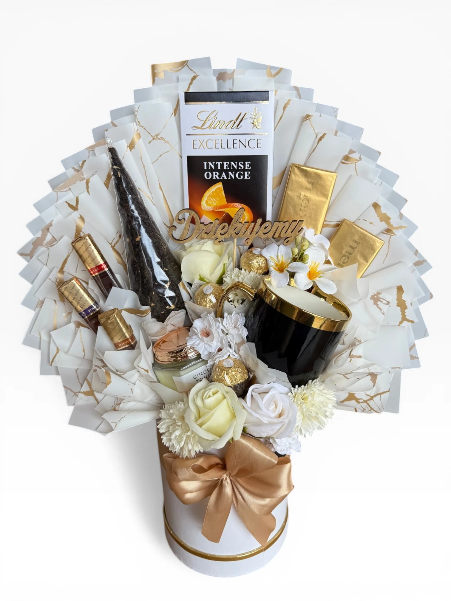 W sercu tego okazałego bukietu od PrezentoweLove znajdziesz nie tylko wyselekcjonowane słodkości o cytrusowej nucie, ale także aromatyczną herbatę sypaną oraz designerski, czarno-złoty kubek. Całość została skomponowana na bazie jasnych barw, co nadaje upominkowi lekkości i czyni go niezwykle uniwersalnym, a zarazem prestiżowym gestem.