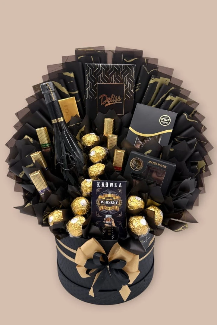Zestaw prezentuje się niezwykle okazale dzięki zastosowaniu dużego, okrągłego boxu typu hat-box w kolorze głębokiej czerni. Pudełko zdobią eleganckie złote pasy oraz ręcznie wiązana, dwukolorowa satynowa wstążka. Całość kompozycji wspiera dekoracyjne tło z czarno-złotego papieru, które nadaje zestawowi trójwymiarowości i prestiżowego charakteru.