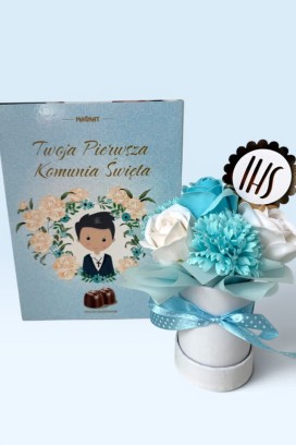 Błękitny Duet Komunijny – Zestaw z Bombonierką Magnat i FlowerBoxem dla Chłopca
