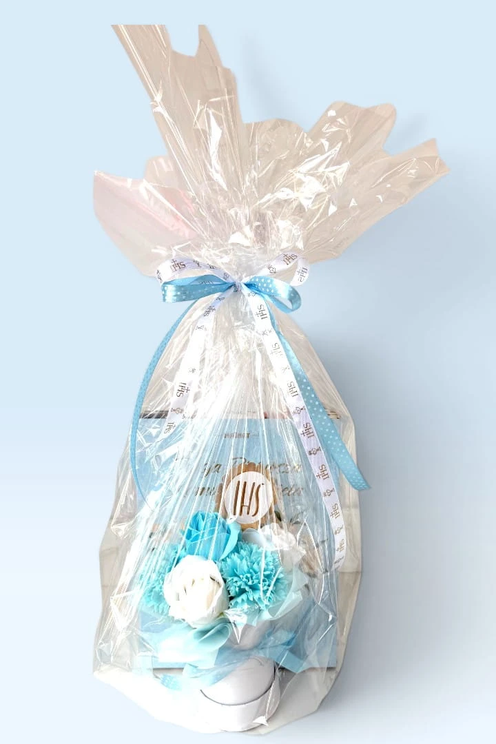 Jasna, błękitna kolorystyka symbolizuje czystość i spokój, a starannie dobrane detale sprawiają, że upominek prezentuje się niezwykle prestiżowo. To idealne połączenie słodkiej przyjemności z pamiątką, która na długo po uroczystości będzie przypominać o tym ważnym wydarzeniu.