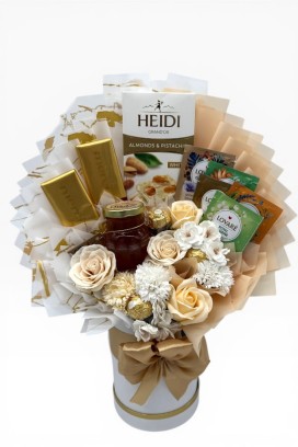 Starannie skomponowane wnętrze łączy w sobie smaki szlachetnych orzechów, delikatnego miodu oraz wyselekcjonowanych herbat. Całość osadzona jest w estetycznym flowerboxie, w którym kwiaty mydlane w kolorze ecru idealnie współgrają ze złotymi detalami opakowań, tworząc prezent gotowy do wręczenia najbadziej wymagającym osobom.
