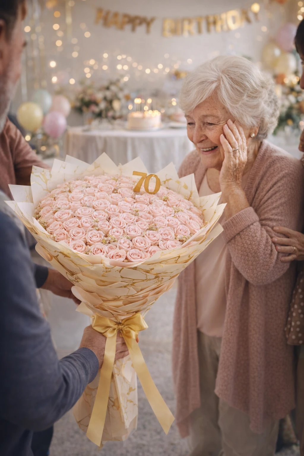 Tip prezentowy: Dobierz topper z dopasowanym napisem (np. „70”, „Najlepszego”, „Kocham Cię”), aby nadać bukietowi jeszcze bardziej osobisty charakter.