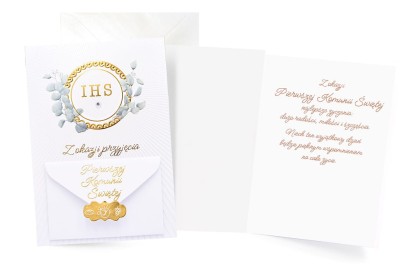 Okładka kartki zachwyca delikatną grafiką gałązek eukaliptusa, które otaczają złoty, tłoczony medalion z symbolem IHS i błyszczącym kryształkiem. Tło zdobi subtelny motyw promienistych linii, nadający całości lekkości. Wyjątkowym elementem jest umieszczona na froncie mała koperta z napisem "Pierwszej Komunii Świętej", zamknięta ozdobną, złotą plombą z symbolami eucharystycznymi – to elegancki i dyskretny sposób na przekazanie daru ołtarza.