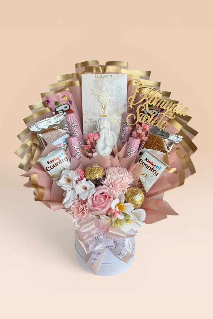 W sercu tego bukietu słodyczy znajduje się urocza figurka aniołka oraz elegancka czekolada z motywem hostii, co nadaje całości głębokiego, symbolicznego znaczenia. To idealne połączenie dziecięcej radości z podniosłym charakterem sakramentu, które z pewnością wywoła uśmiech na twarzy każdej dziewczynki.