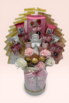 Całość została utrzymana w prestiżowej kolorystyce pudrowego różu, bieli i szlachetnego złota. Starannie wyselekcjonowane słodycze premium zostały wkomponowane w bogatą dekorację z aksamitnych kwiatów i złotych akcentów, tworząc prezent, który olśniewa wyglądem i rozpieszcza podniebienie. To idealny sposób, by podkreślić wagę sakramentu Pierwszej Komunii Świętej w niezwykle stylowy i dziewczęcy sposób.