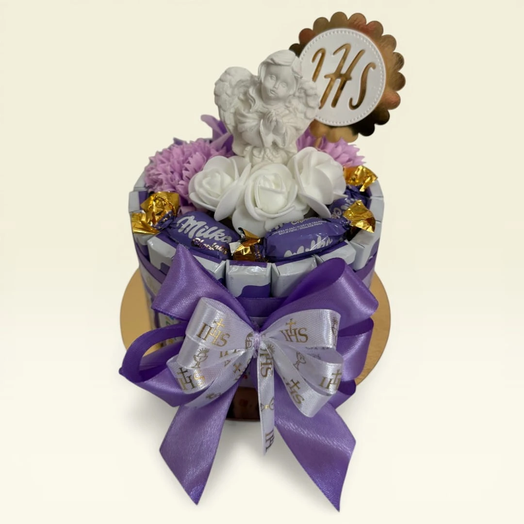 Centralnym punktem zestawu jest delikatna figurka aniołka oraz dekoracyjny symbol IHS, które nadają całości duchowego znaczenia. To niewielki, ale bardzo stylowy prezent, który łączy słodką przyjemność z trwałą pamiątką.